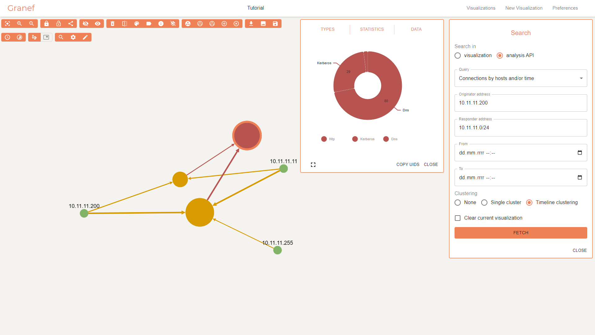 User information is typically part of domain-related communications within the local network. Therefore, we start the analysis using the query "Connections by hosts and/or time", where we specify the hosts' address as the Originator address and the local network range as the Responder address, and times stay unfilled. Since we expect more connections, we choose Timeline clustering to avoid overloading the visualization.